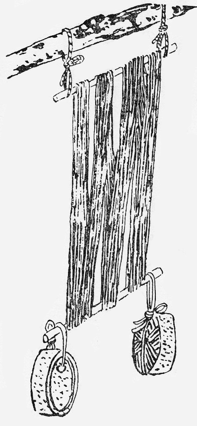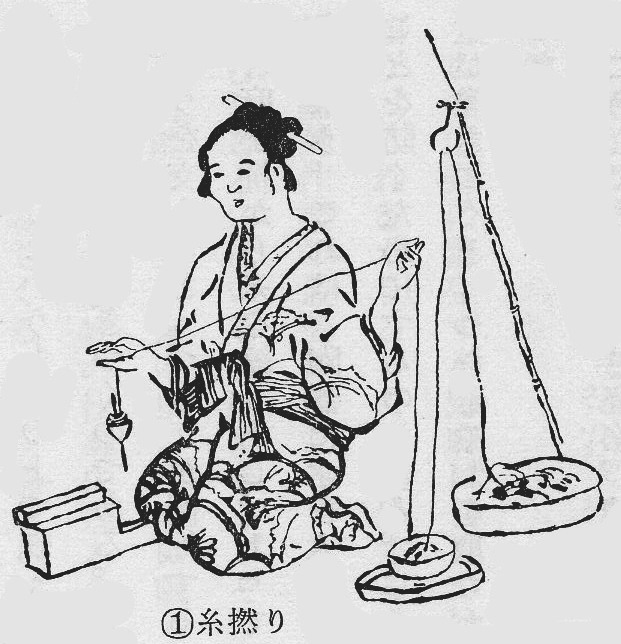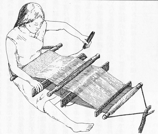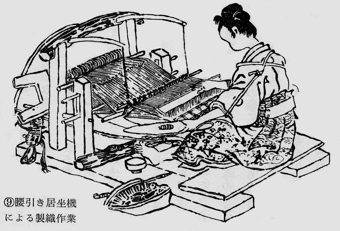 弥生時代には綜絖(そうこう)や筬(おさ)が加えられた織機が出現した。これにより緯糸(よこいと)を通す作業が容易になり、織る速度が速くなる。一方、織手の腰に回した腰当で経糸を緊張状態にし、綜絖で開口するときにはゆるめるという調節を行うので、身体的負担も大きい。一度作業を始めるとキリのいいところまでやらないと、機から抜けられないのでトイレにも困っただろう。図では脇に茶碗と手炙り、煙管が置いてあり現場で休憩をとっていたことがわかる。