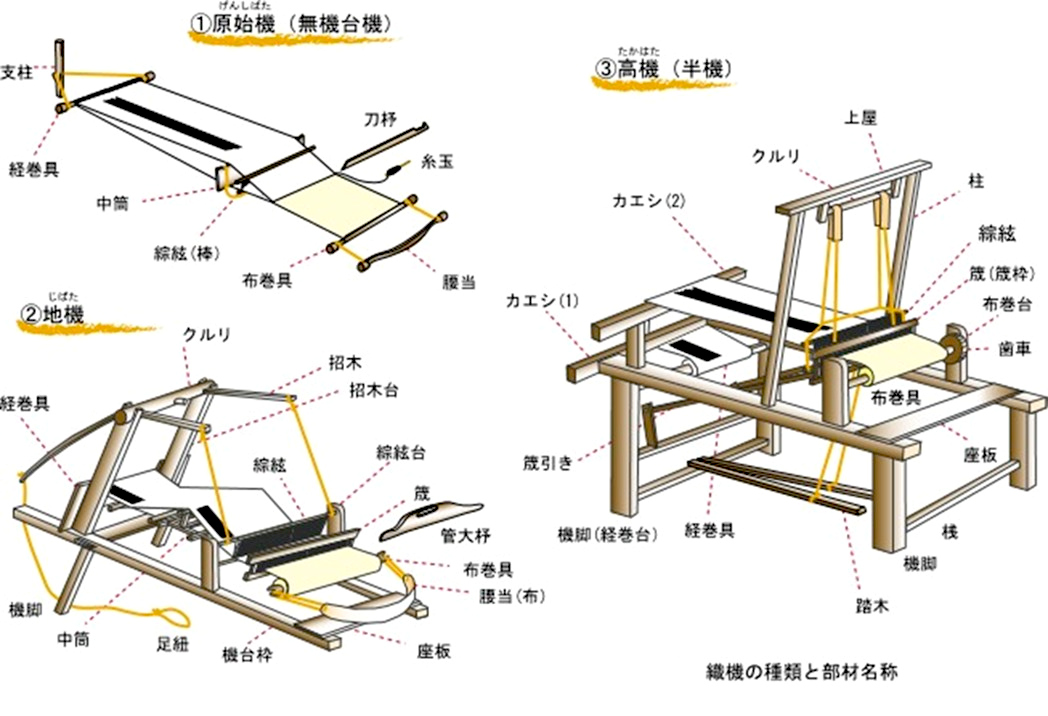 代表的織機の型を下図に示す。この図は大阪府文化財センター、日本民家集落博物館の企画展示『はたおりの歴史展』(2006)での解説パンフレット所載のものだが、一目で発達の経過がわかるので借用させていただいた。