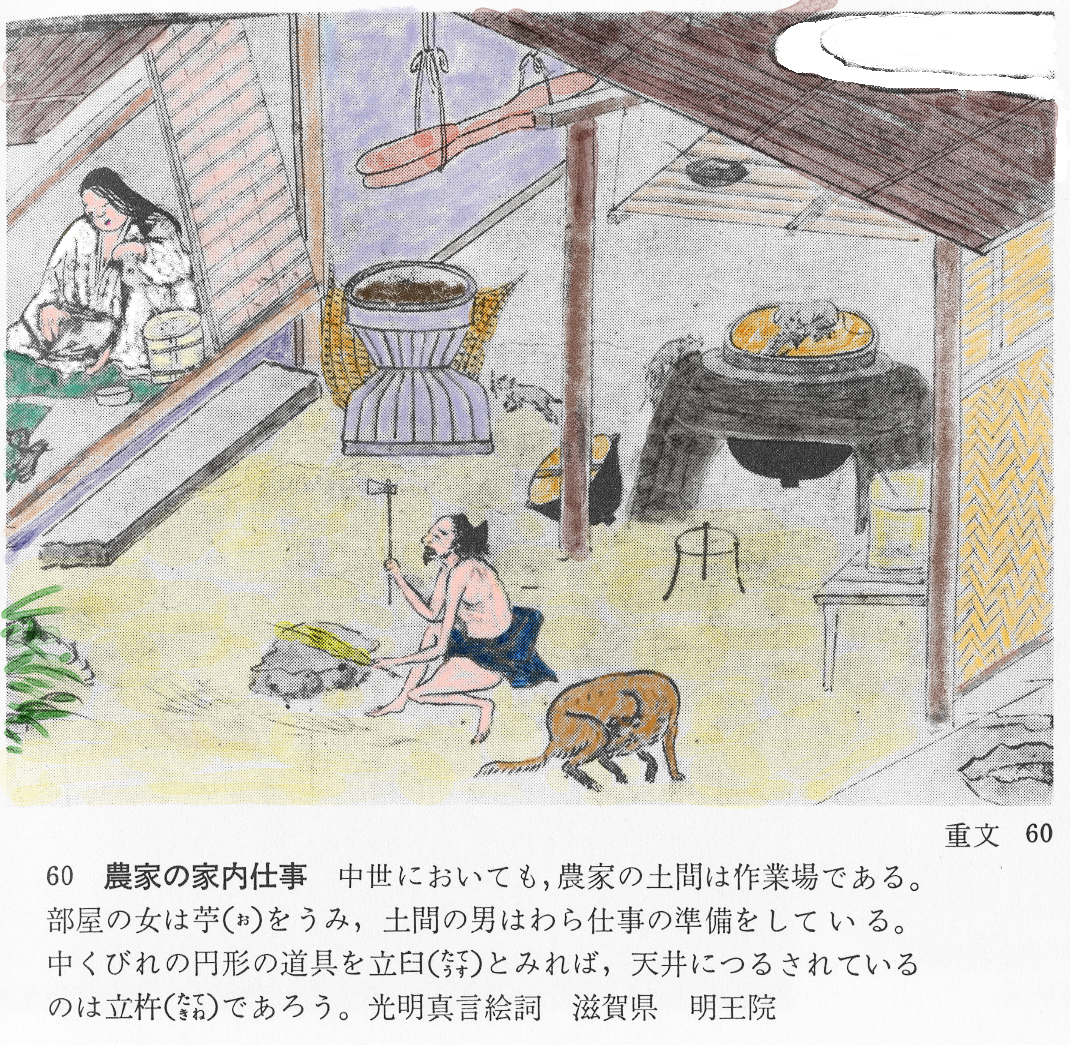 この作業は青苧を細かく裂いて取り出した繊維(長さ約0.8~1.2m)を長い1本の繊維につないでゆく作業である。これは繊維を結ぶのではなく、2本の繊維の端をほぐして、互いにからませて、つなぐ繊細な作業である。これが苧麻布を生産する上で最も長い時間を要する工程(全工程の7~8割)である。下の図は室町時代に描かれた農家の家仕事の一場面である。女性は時間ある限り、青苧から糸を績む仕事に精出していたようだ。立膝の前には水を入れた茶碗が置いてあり、繊維を湿らしながら績いでゆく。糸は績桶(おおけ)にふんわりと絡まないように貯められている。(光明真言絵詞、滋賀県明王院、図説日本文化の歴史6、南北朝・室町、p.70,小学館)