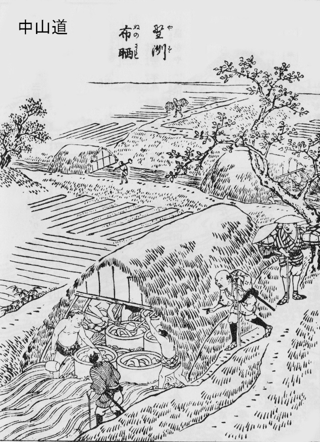 近世の奈良晒、高宮晒などは、織り上げた布を灰汁で煮た後、臼で搗き、川の流れで洗い川原で乾すという作業を繰り返すことで、純白の生地が得られ染色性が向上した。近江、野洲川での晒もこれにあたる(近江名所図会、p.282、柳原書店、1974)。