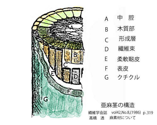 苧麻を刈取り、水に漬け表皮を剥がし、その下の靭皮組織を取り出す。これが青苧といわれる半製品である。靭皮組織の内側に繊維組織があり、最終的に、これが糸として使われる。芯の木質部は除去廃棄される。下図は苧麻と類似した構造を持つ亜麻の断面模式図である。繊維束は柔軟靭皮にくるまれており、精練工程で、これを除去することで繊維がしなやかになる。青苧は乾燥した状態で保存・輸送が可能で半製品としても流通する。