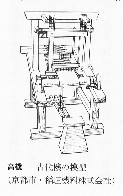 高品質の絹織物は高機でないと難しいと言われる。高機は古墳時代には渡来していた。魏志倭人伝には魏への朝貢物の中に縑(かとり)など絹織物が含まれることから、弥生時代に遡る可能性もある。下の高機の模型図はわざと、狭い幅に描かれているが実機はもっと広幅である。